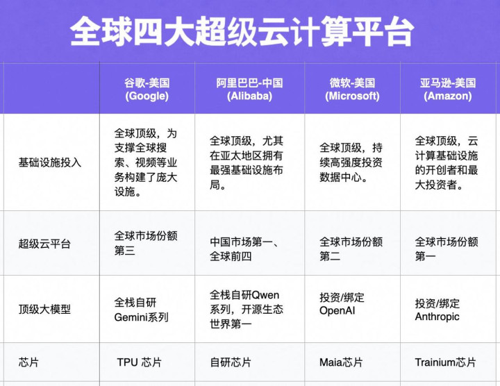 近日,全球AI企业竞争加剧,亚马逊、微软、谷歌和阿里巴巴组成的“四强”格局占据了80%的云平台市场份额。阿里巴巴是全球除美国三朵云之外最重量级的选手,正在以AI基础设施、超级云平台、顶尖大模型和算力芯片的全方位投入,角逐全球四朵超级AI云竞赛。