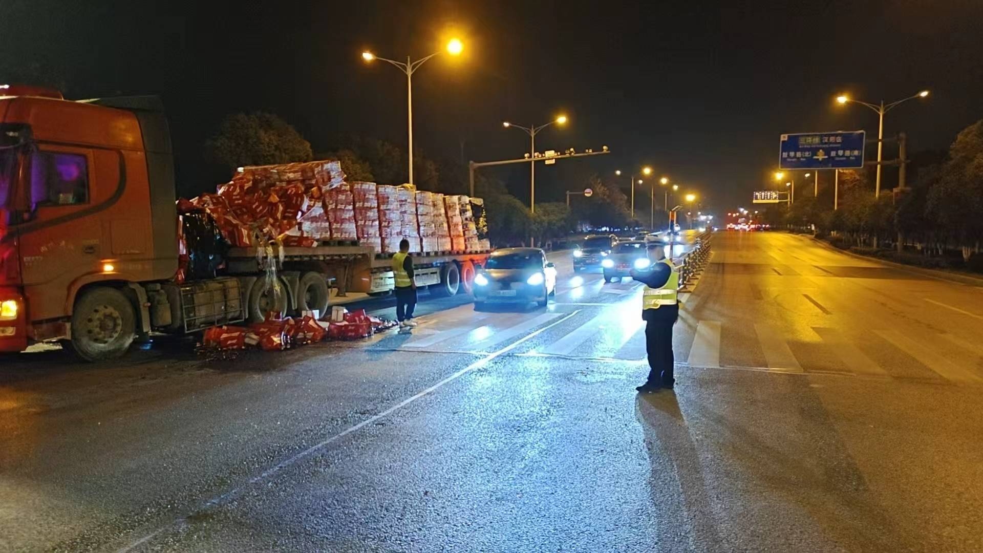 (通讯员:周鸿晨 李璐)2026年1月15日19时30分,武汉蔡甸新天大道中法一初附近路段发生一起货物洒落事件。一辆行驶中的大货车因装载不稳,导致大量箱装啤酒意外掉落,部分玻璃瓶碎裂,碎玻璃与包装物散落在半幅机动车道上,严重影响车辆通行,造成现场交通短暂拥堵。