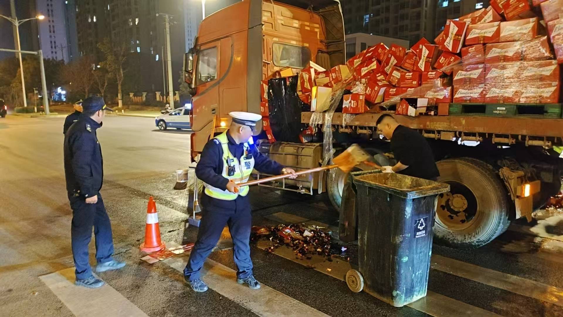 七中队中队长易立秋接到报告后,立即协调城管部门协助清理。城管工作人员携带铁锹等工具迅速赶到,与辅警合力将碎玻璃、纸箱等杂物集中清运。货车所属企业人员也赶到现场,协助转运未破损货物,最大限度减少损失。各部门人员紧密配合,历经一小时紧张作业,20时46分,路面全部清理完毕,交通恢复正常。整个过程中未引发次生事故,车辆有序通行。现场处置完毕后,货车司机对赶来救援的交警、城管及企业工作人员表达了诚挚感谢。