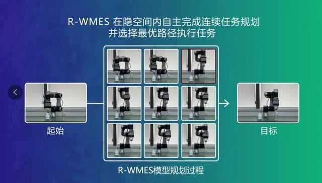 在演示视频中看到,当给机器人一个插有吸管的玻璃瓶图片作为目标,机器人随即对现场环境进行观察,看到一个没有吸管的玻璃瓶。此时,R-WMES系统通过在隐空间规划,生成一套完整的机器人动作方案:指令机器人先抓取一根吸管,再插入玻璃瓶,从而使最终结果与预设的“带吸管玻璃瓶”目标图片完全一致。