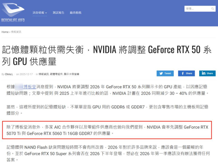 由台媒 Benchlife 消息,NVIDIA 将会在明年对 RTX 50 系显卡进行减产。