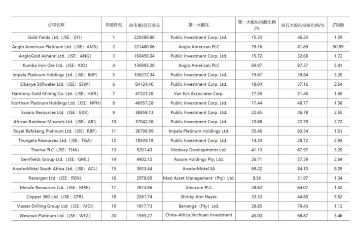 表12023年约翰内斯堡证券交易所市值排名前20的矿业公司股权份额情况