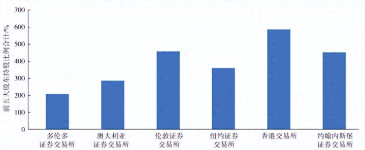 香港交易所与约翰内斯堡证券交易所股权集中度较高,多伦多证券交易所股权分散度最大